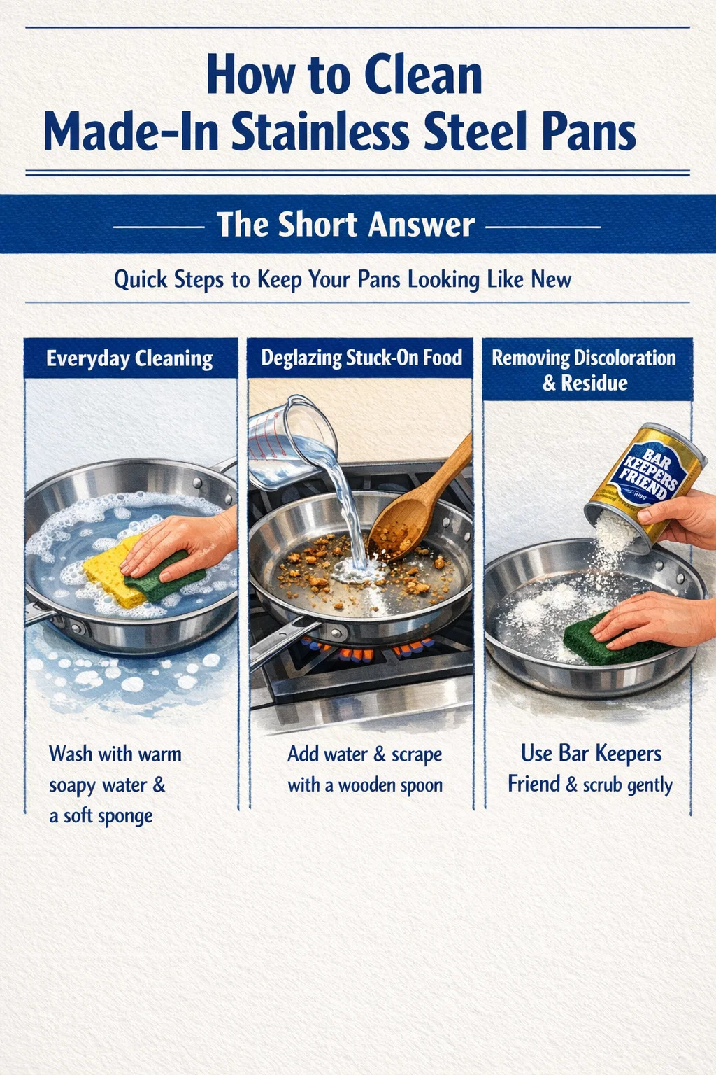 Made-In kokkärl i rostfritt stål är byggd med en 5-lagers klädd konstruktion - vanligtvis två lager av rostfritt stål bundna runt en aluminium- och kopparkärna - vilket gör det mycket hållbart och motståndskraftigt mot vridning. Men rostfritt stål är inte non-stick, och om du inte vet hur du rengör det ordentligt kommer du att sluta med regnbågsfläckar, vita kalciumavlagringar eller mörka brännmärken som får dina kastruller och kastruller att se förstörda ut när de faktiskt är perfekt räddningsbara.